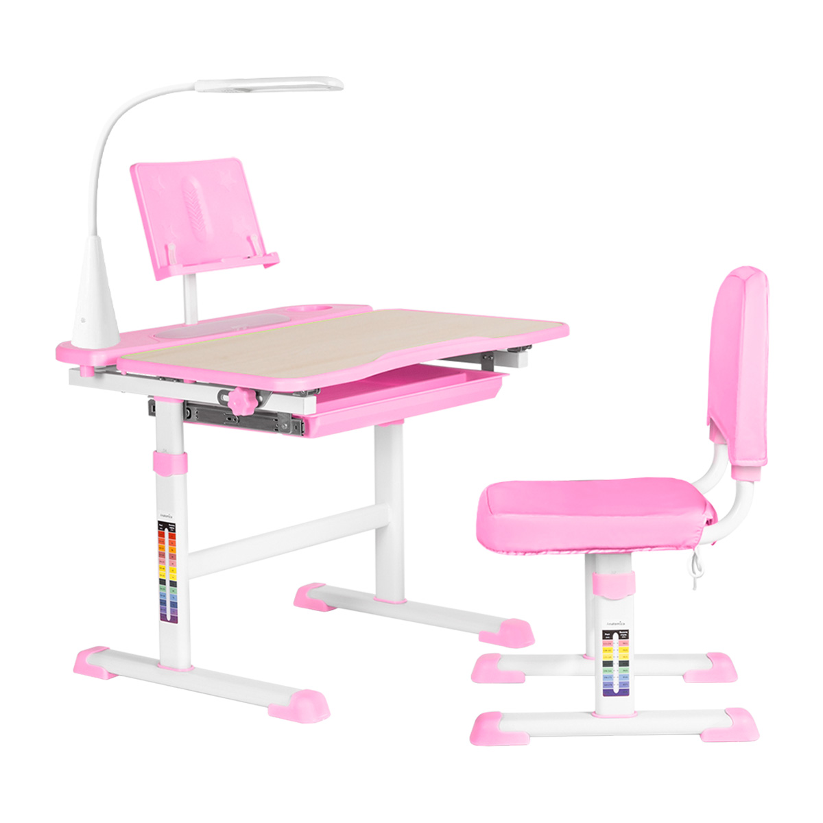 Детский набор Avgusta Comfort со светильником включает в себя всё необходимое для занятий: он состоит из школьной парты, стула и чехла для него, а так же подставки для книг и лампы. В отличие от обычного письменного стола, вам не составит труда настроить правильный угол в сгибе коленного сустава при посадке – 90°. Благодаря регулировке высоты стола и стула, а также регулировке угла наклона столешницы комплект прослужит ребенку с детского сада до конца младшей школы. Сидя за такой партой, у первоклассника есть все комфортные условия для письма, рисования, творчества и игр.